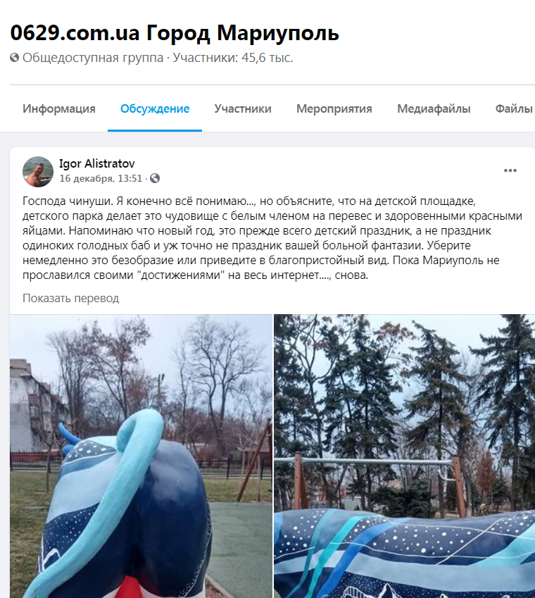 Як написав на сторінці спільноти 0629.com.uaNews у ФБ Igor Alistratov “я все розумію… Але поясніть, що на дитячому майданчику дитячого парку робить цей монстр з білим членом і здоровими червоними яйцями. Нагадую, що Новий рік – це в першу чергу дитяче свято, а не свято одиноких голодних жінок, і точно не свято вашої хворої уяви. Приберіть це неподобство негайно або приведіть його в пристойну форму. Доки Маріуполь не прославився своїми “досягненнями” на увесь інтернет знову”.