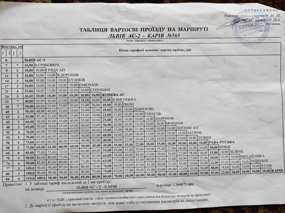 - Таблиця вартості проїзду на маршруті Львів АС-2 – Карів
