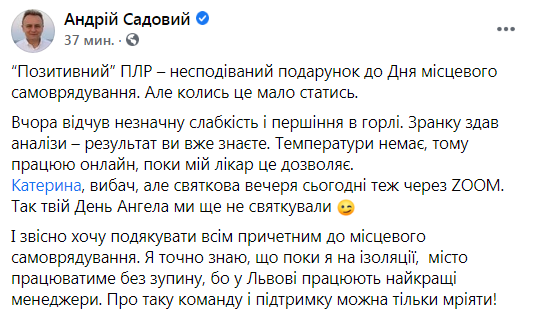 «Вчора відчув незначну слабкість і першіння в горлі. Зранку здав аналізи – результат ви вже знаєте. Температури немає, тому працюю онлайн, поки мій лікар це дозволяє», – зазначається у дописі.