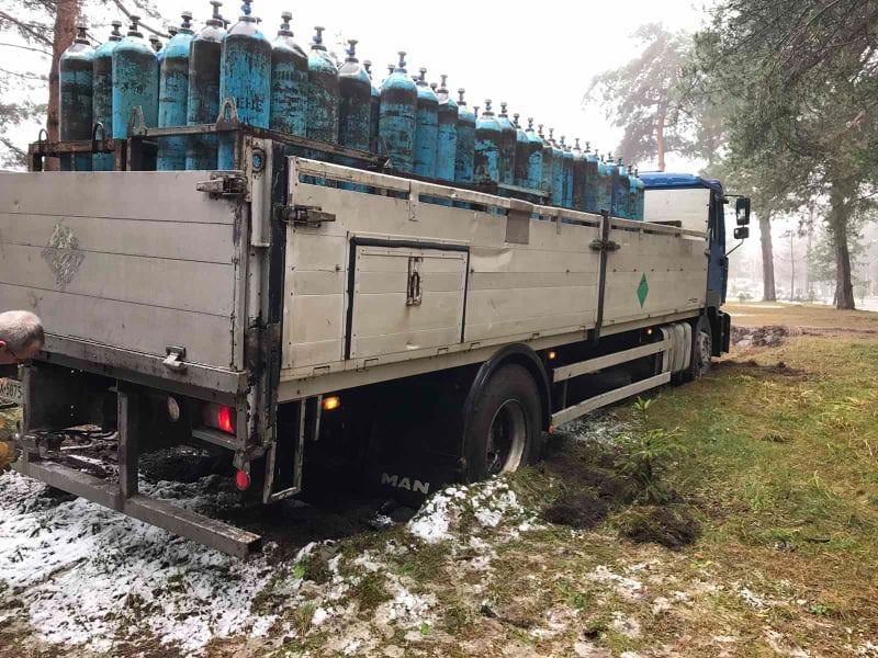Як пише «Четверта студія», у ГУ ДСНС у Львівській області повідомили, що 1 січня о 11:08 до Служби порятунку «101» надійшло повідомлення про те, що в м. Новояворівськ на вул. Шевченка,18, на території Новояворівської районної лікарні на м’якому ґрунті застряг автомобіль «MAN S2000». Автомобіль здійснював довіз кисневих балонів до лікарні.