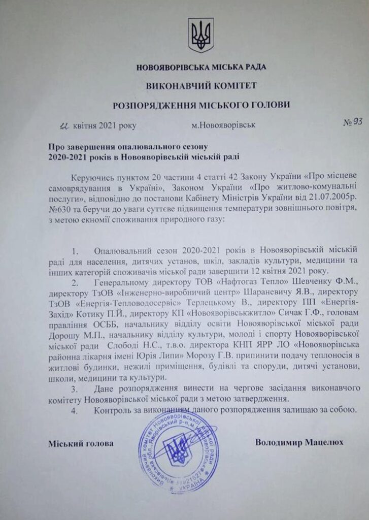 Відповідно до розпорядження міського голови Володимира Мацелюха, опалювальний сезон 2020/2021р. в Новояворівській міській раді завершено для населення, дитячих установ, шкіл, закладів культури, медицини та інших категорій споживачів міської ради з 12 квітня 2021 року.