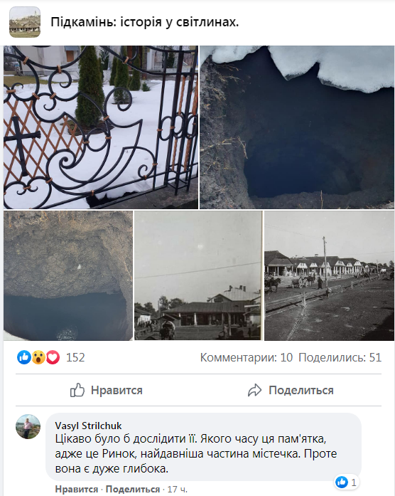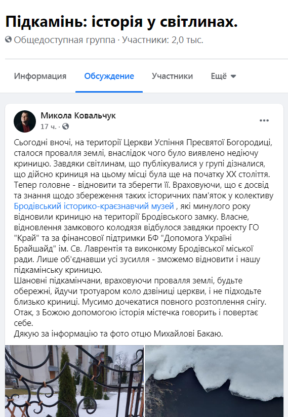 «На території Церкви Успіння Пресвятої Богородиці, сталося провалля землі, внаслідок чого було виявлено недіючу криницю. Завдяки світлинам, що публікувалися у групі дізналися, що дійсно криниця на цьому місці була ще на початку ХХ століття. Тепер головне – відновити та зберегти її. Враховуючи, що є досвід та знання щодо збереження таких історичних пам’яток у колективу Бродівського історико-краєзнавчого музею, які минулого року відновили криницю на території Бродівського замку. Власне, відновлення замкового колодязя відбулося завдяки проекту ГО “Край” та за фінансової підтримки БФ “Допомога Україні Брайшайд” ім. Св. Лаврентія та виконкому Бродівської міської ради. Лише об’єднавши усі зусилля – зможемо відновити і нашу підкамінську криницю. Шановні підкамінчани, враховуючи провалля землі, будьте обережні, йдучи тротуаром коло дзвіниці церкви, і не підходьте близько криниці. Мусимо дочекатися повного розтоплення снігу. Отак, з Божою допомогою історія містечка говорить і повертає себе», – зазначається у дописі.