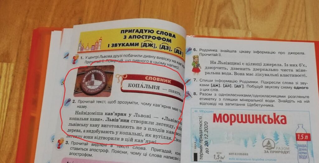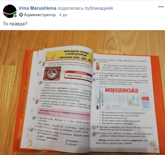 Також у згаданому підручнику є реклама води “Моршинська”.