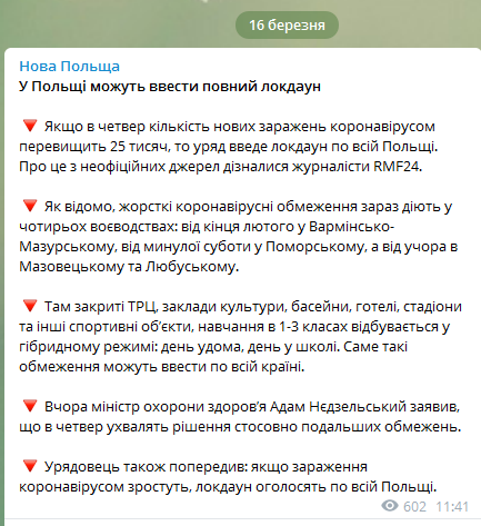 «Вчора міністр охорони здоровʼя Адам Нєдзельський заявив, що в четвер ухвалять рішення стосовно подальших обмежень. Урядовець також попередив: якщо зараження коронавірусом зростуть, локдаун оголосять по всій Польщі»,- зазначається у повідомленні.
