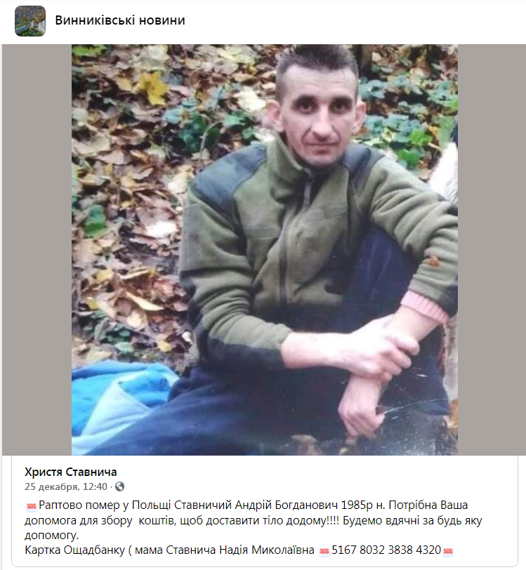 «Раптово помер у Польщі Ставничий Андрій Богданович 1985р н. Потрібна Ваша допомога для збору коштів, щоб доставити тіло додому! Будемо вдячні за будь-яку допомогу. Картка Ощадбанку (мама Ставнича Надія Миколаївна:5167 8032 3838 4320)», – зазначає у дописі Христя Ставнича на сторінці спільноти «Винниківські новини».