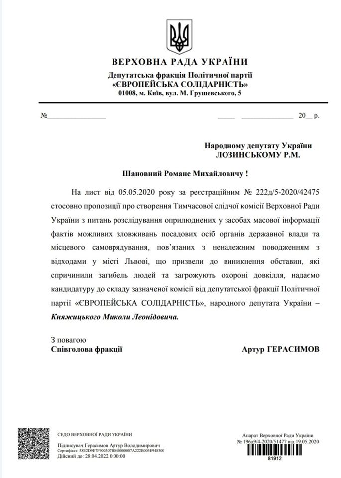 “Ось лист нашої фракції, яка мене туди давно делегувала”,- зазначив Княжицький у коментарі до оприлюденої світлини документу.