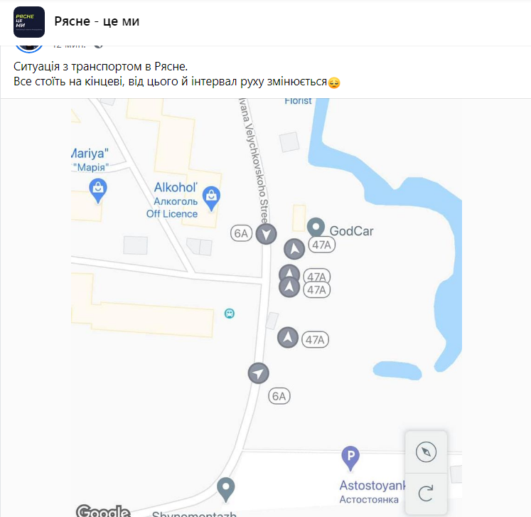 «Ситуація з транспортом в Рясне. Все стоїть на кінцевих, від цього й інтервал руху змінюється», – зазначив у дописі на сторінці спільноти “Рясне – це ми” у ФБ Oleg Chupylo.