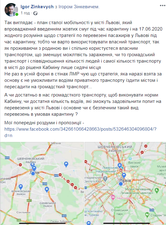 А чи достатньо в нас громадського транспорту, щоб виконувати норми Кабміну, чи достатня кількість водіїв, які зможуть задовільнити попит на перевезення у місті Львові і основне чи є безпечним такий вид перевезень в умовах карантину ?”, – зазначає Зінкевич.