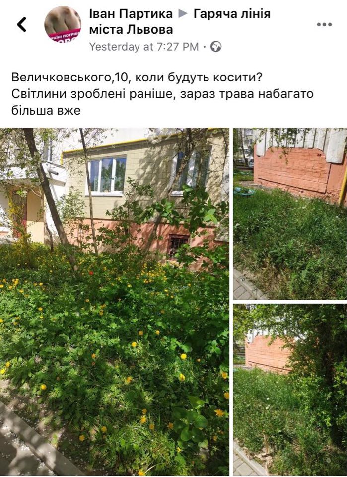 “Величковського, 10, коли будуть косити? Світлини зроблені раніше, зараз трава набагато більша”, – йдеться у дописі.