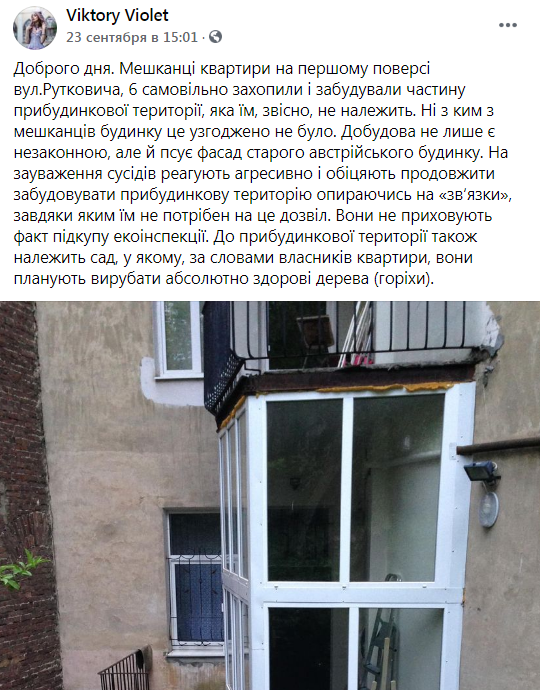 «Мешканці квартири на першому поверсі вул. Рутковича, 6 самовільно захопили і забудували частину прибудинкової території, яка їм, звісно, не належить. Ні з ким з мешканців будинку це узгоджено не було. Добудова не лише є незаконною, але й псує фасад старого австрійського будинку. На зауваження сусідів реагують агресивно і обіцяють продовжити забудовувати прибудинкову територію опираючись на «зв‘язки», завдяки яким їм не потрібен на це дозвіл. Вони не приховують факт підкупу екоінспекції. До прибудинкової території також належить сад, у якому, за словами власників квартири, вони планують вирубати абсолютно здорові дерева (горіхи)», – зазначається у тексті звернення на «Гарячу лінію міста Львова» Viktory Violet.