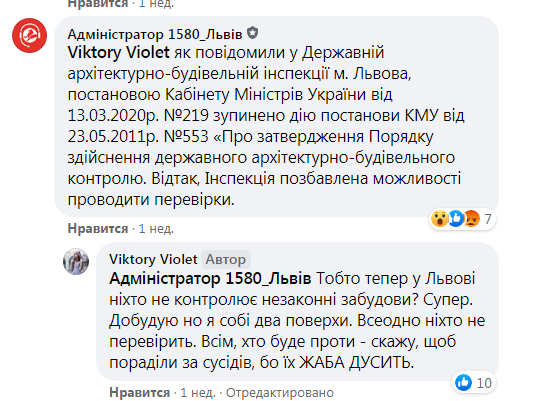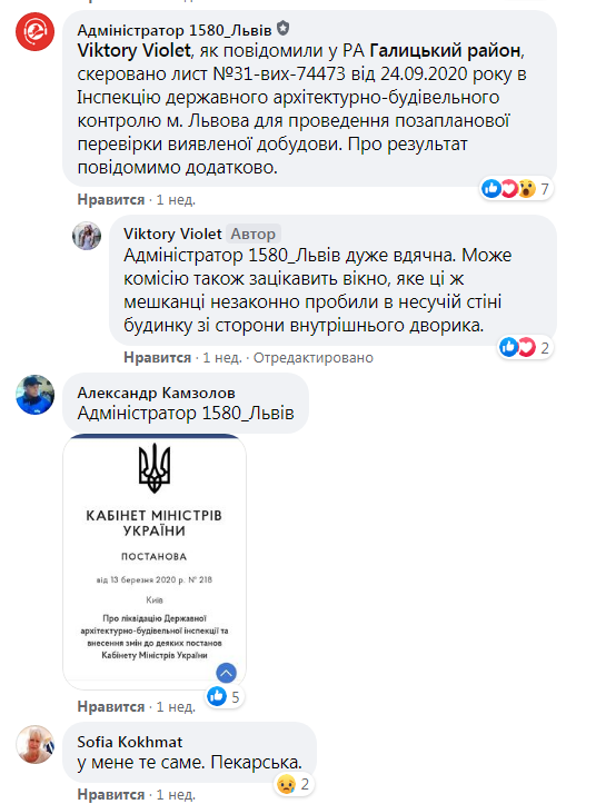 У відповіді на дане звернення, адміністратор «Гарячої лінії міста Львова» відповів, що «як повідомили у Державній архітектурно-будівельній інспекції м. Львова, постановою Кабінету Міністрів України від 13.03.2020р. №219 зупинено дію постанови КМУ від 23.05.2011р. №553 «Про затвердження Порядку здійснення державного архітектурно-будівельного контролю. Відтак, Інспекція позбавлена можливості проводити перевірки».