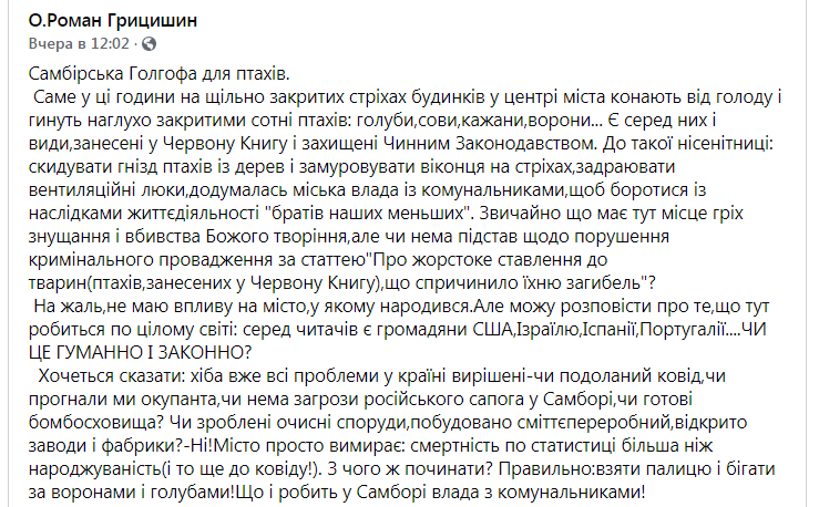 «Самбірська Голгофа для птахів. Саме у ці години на щільно закритих стріхах будинків у центрі міста конають від голоду і гинуть наглухо закритими сотні птахів: голуби, сови, кажани, ворони… Є серед них і види, занесені у Червону Книгу і захищені чинним законодавством. До такої нісенітниці: скидувати гнізда птахів із дерев і замуровувати віконця на стріхах, задраювати вентиляційні люки, додумалась міська влада із комунальниками, щоб боротися із наслідками життєдіяльності “братів наших менших”.