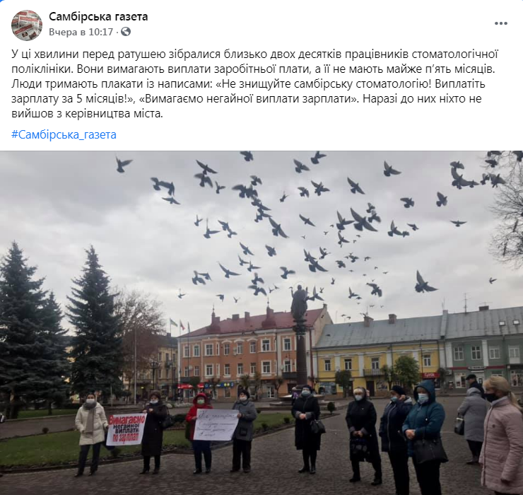 У Самборі 20 листопада перед ратушею зібралися близько двох десятків працівників стоматологічної поліклініки. Вони вимагали виплати заробітної плати, яку їм боргують майже п’ять місяців.