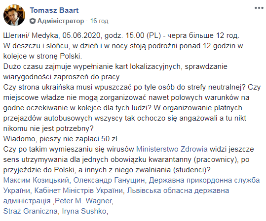 «Потрібно час заповнити карти розташування, перевірку запрошень на роботу. Чи має українська сторона дозволити перебування стількох людей в нейтральній зоні? Невже місцева влада не може організувати умови для гідного очікування в черзі на цих людей?», – зазначив у коментарі до світлин Томаш Барт.