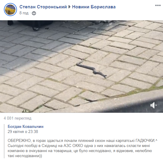 «Обережно, в горах здається почали пляжний сезон наші карпатські гадючки. В Східниці на АЗС ОККО одна з них намагалась скласти мені компанію в очікуванні на товариша, це було несподівано, я відмовив, не люблю такі несподіванки», – зазначив у своєму дописі автор відео Богдан Ковальчин.