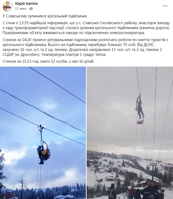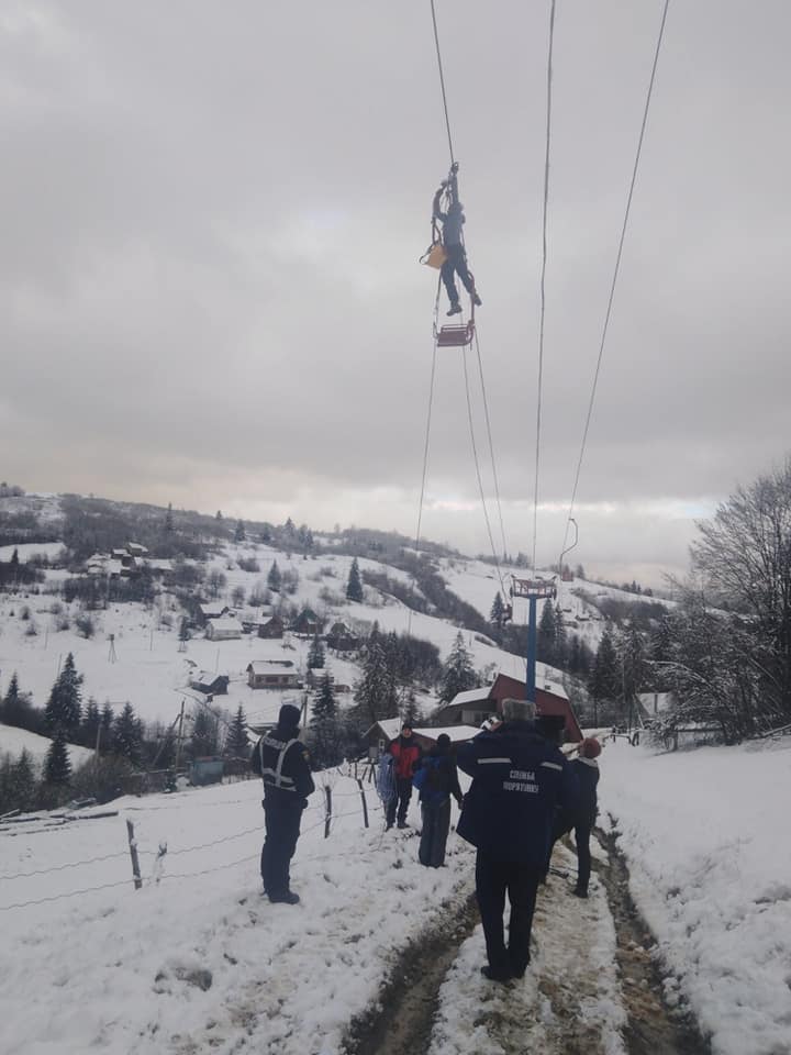 «Станом на 14:20 гірничо-рятувальними підрозділами розпочато роботи по зняттю туристів з крісельного підйомника. Всього на підйомнику перебуває близько 70 осіб. Від ДСНС залучено 16 чол. о/с та 2 од. техніки. Додатково направлено 11 чол. о/с та 2 од. техніки 2 СЦШР (м. Дрогобич). Температура повітря 1 градус тепла.