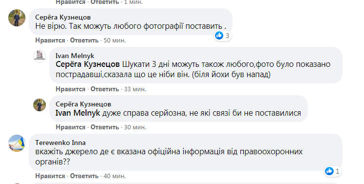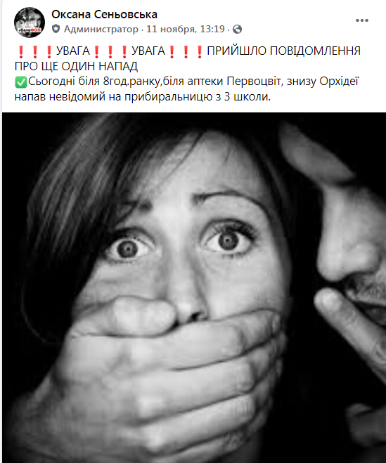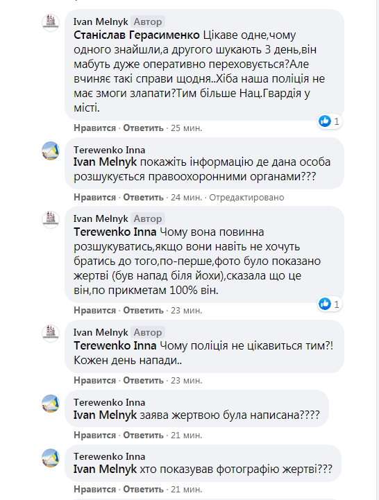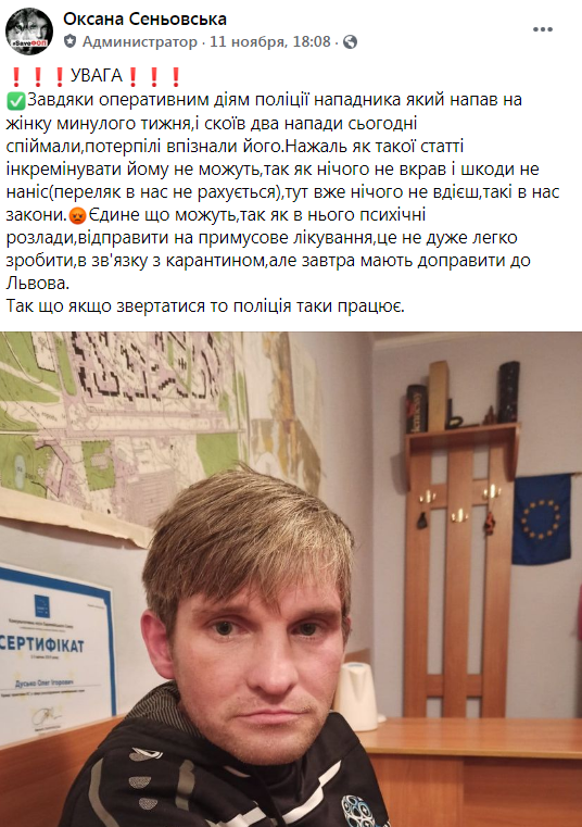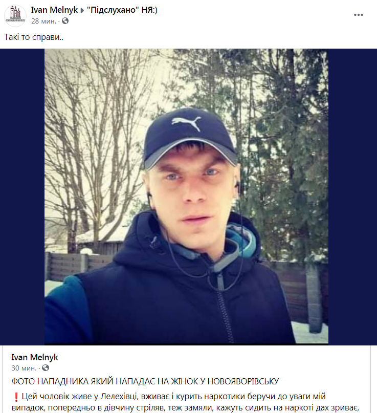 Наразі, станом 13.11.2020 нападник зі своїми товаришами на волі, знаходиться ще досі у м.Новояворівськ. Жінки і дівчата будьте обачні! Він може бути сам або з товаришами», – написав Ivan Melnyk.
