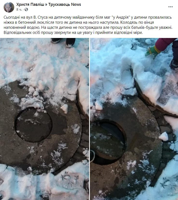 «На вул. В.Стуса на дитячому майданчику біля маг “у Андрія” у дитини провалилась ніжка в бетонний люк, після того як дитина на нього наступила. Колодязь по вінця наповнений водою. На щастя, дитина не постраждала але прошу всіх батьків – будьте уважні. Відповідальних осіб прошу звернути на це увагу і прийняти відповідні міри»,- зазначається у дописі Христі Павліш на сторінці спільноти Трускавець News.