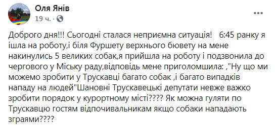«О 6:45 ранку я йшла на роботу, і біля «Фуршету» верхнього бювету на мене накинулись 5 великих собак. Я прийшла на роботу і подзвонила до чергового у міську раду, відповідь мене приголомшила: “Ну що ми можемо зробити у Трускавці багато собак, і багато випадків нападу на людей”.
