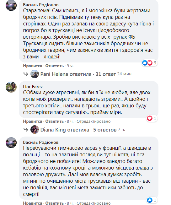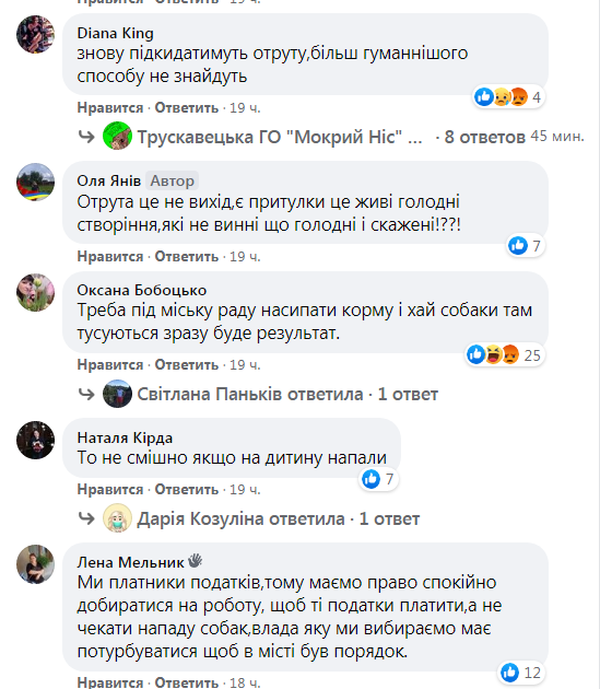 Шановні трускавецькі депутати – невже важко зробити порядок у курортному місті? Як можна гуляти по Трускавцю гостям і відпочивальникам, якщо собаки нападають зграями?», – написала на сторінці спільноти «Міська рада Трускавець» у ФБ Оля Янів.