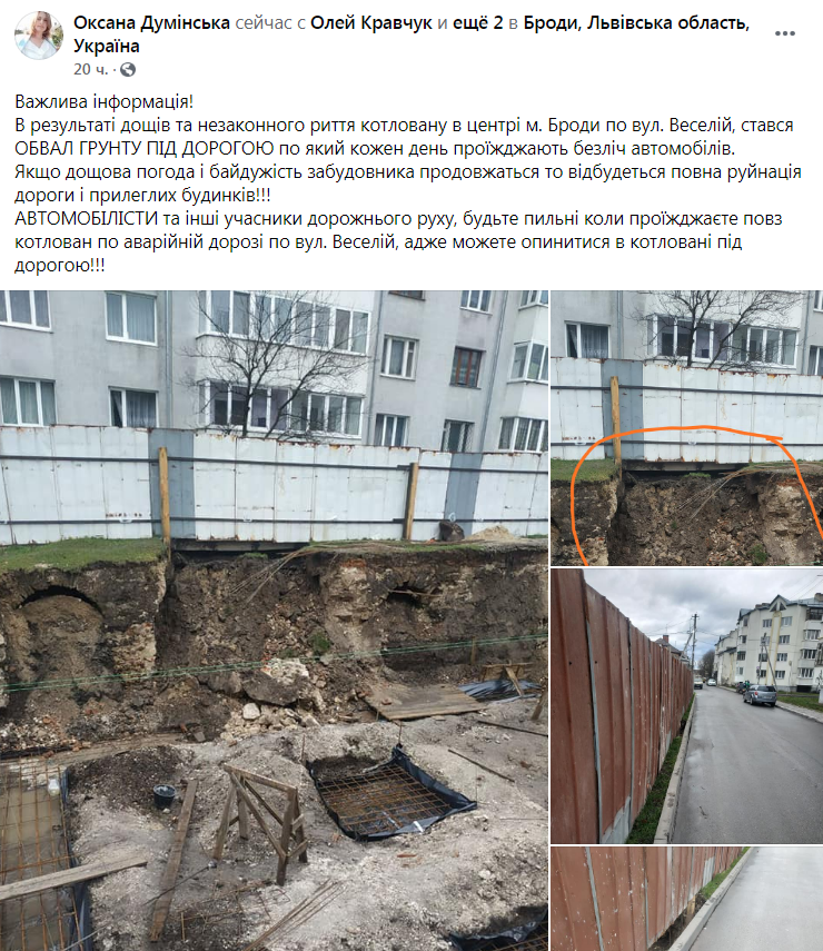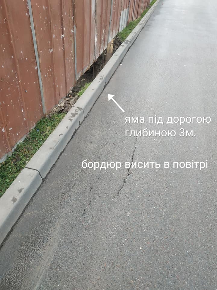 «Якщо дощова погода і байдужість забудовника продовжаться то відбудеться повна руйнація дороги і прилеглих будинків! Автомобілісти та інші учасники дорожнього руху, будьте пильні коли проїжджаєте повз котлован по аварійній дорозі по вул. Веселій, адже можете опинитися в котловані під дорогою!», – зазначається у дописі.