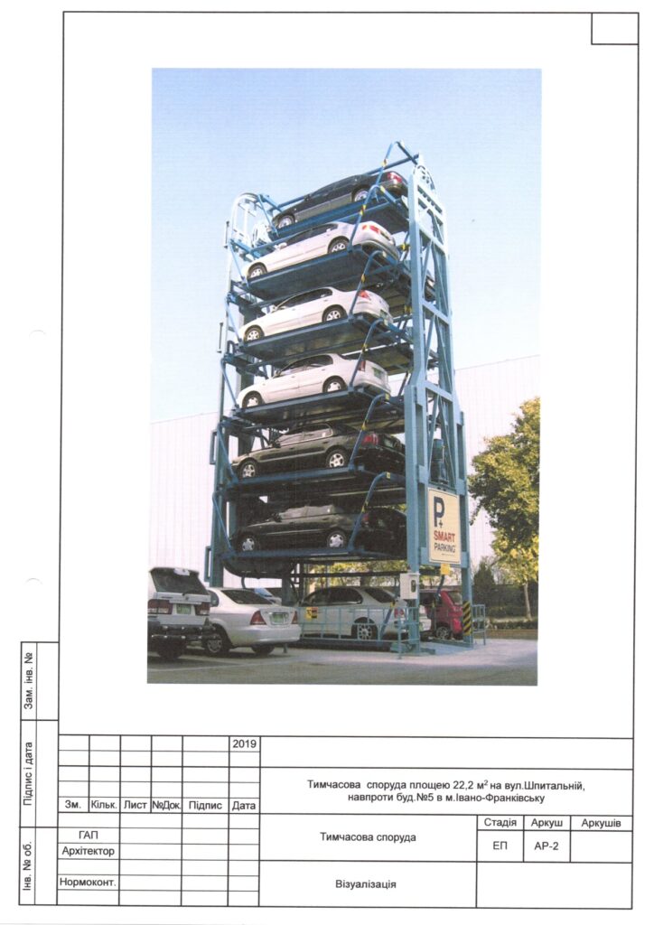 Як зазначається, «в місті з’явиться багаторівневий автоматичний паркінг (БАП). Споруду планується встановити на вул. Шпитальній, навпроти буд. №5. Тип – тимчасова споруда, МАФ. Максимальна місткість – 12 автомобілів. Приблизні габарити в горизонтальній площині 5 х 6,5 м, висота 15,5 м. Встановлюватиме БАП приватний інвестор – без залучення бюджетних коштів».