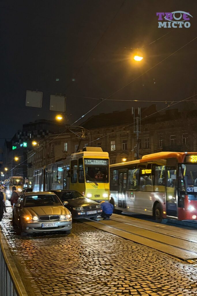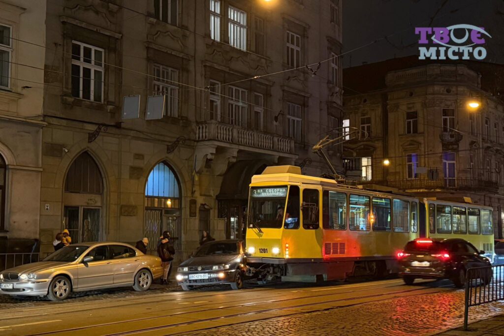 У центрі Львова, перед поворотом на кінцеву трамвайну зупинку на площі Соборній, сталась аварія між автомобілем і трамваєм.