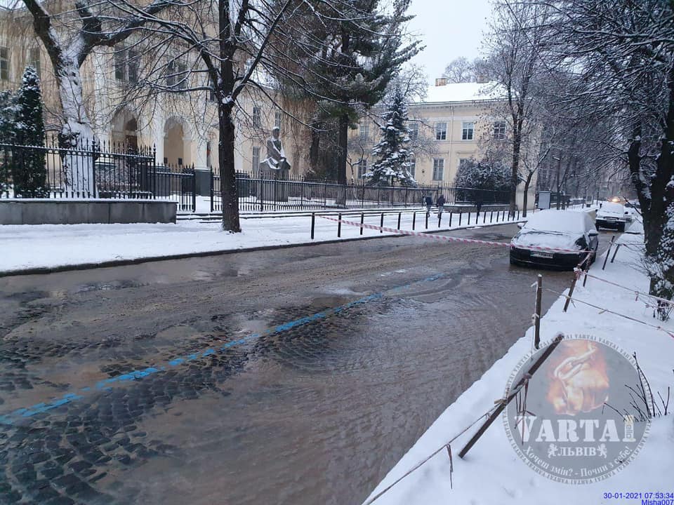Подія сталася на вул. Стефаника, перед перехрестям з вул. Чайковского. Внаслідок прориву води, утворилася яма, в яку провалилося авто.
