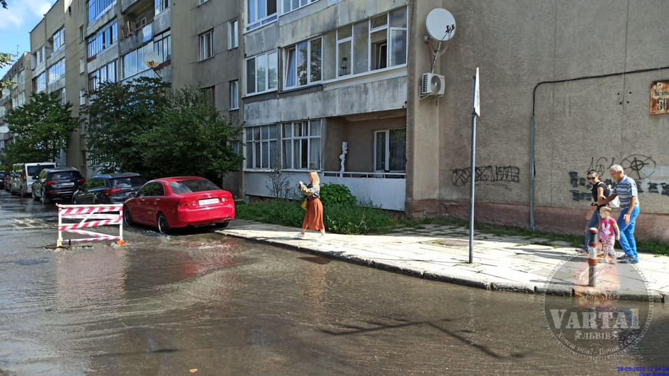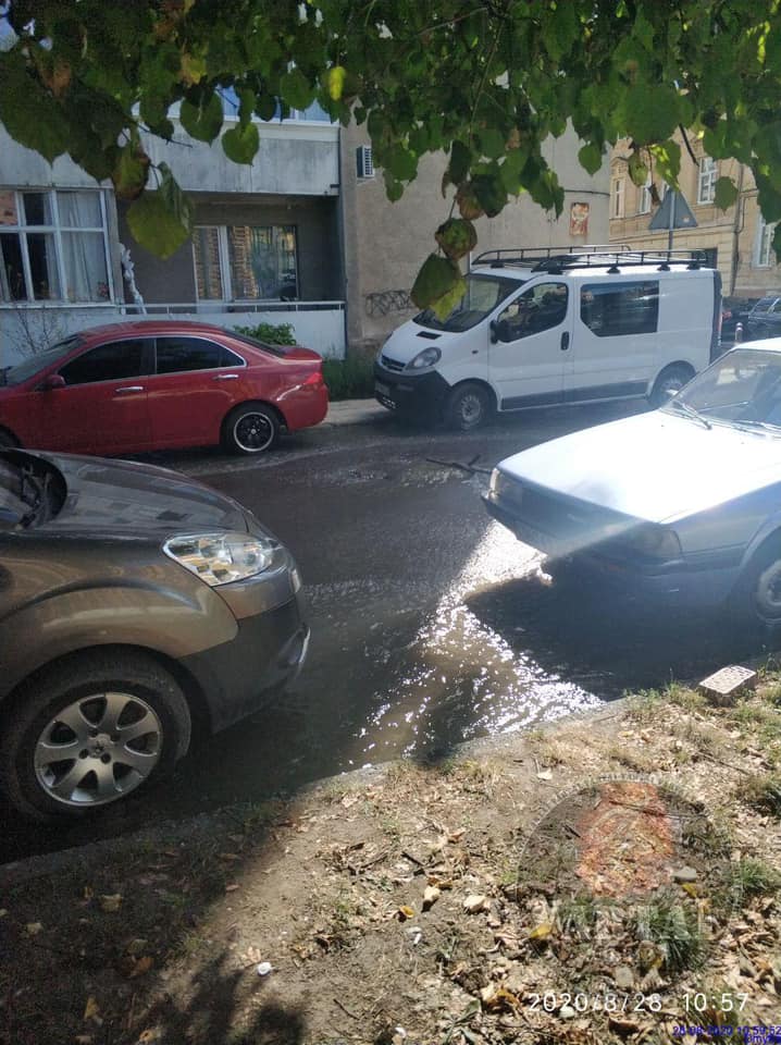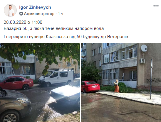 “28.08.2020 о 11:00. Вул. Базарна, 50, з люка тече великим напором вода. І перекрито вулицю Краківська від 50 будинку до Ветеранів”, – повідомив на сторінці ГО “Варта 1” Ігор Зінкевич.