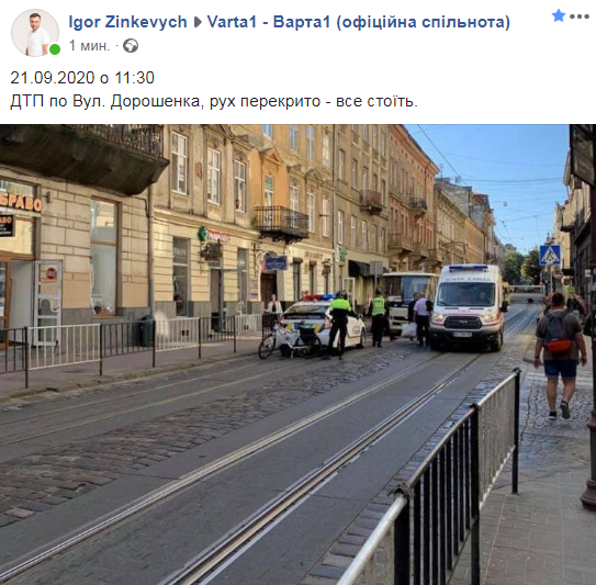 “21.09.2020 о 11:30. ДТП по Вул. Дорошенка, рух перекрито – все стоїть”, – зазначається у повідомленні на сторінці ГО “Варта 1”.