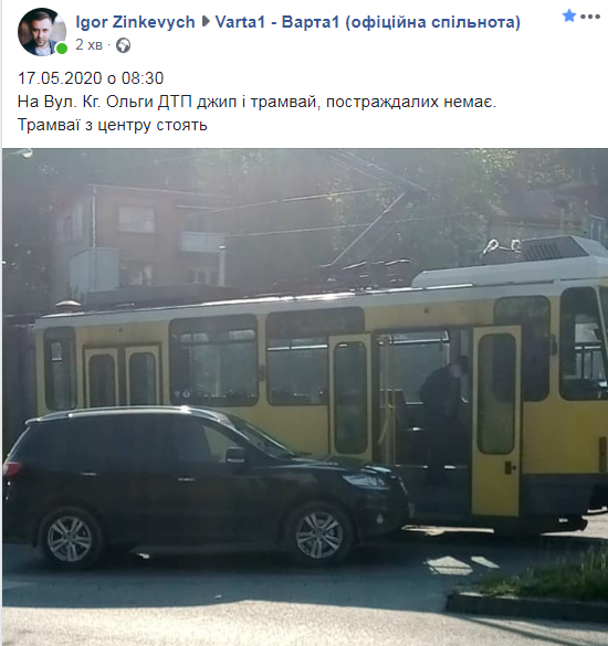 “О 08:30, на вулиці Княгині Ольги ДТП: джип і трамвай. Постраждалих немає. Трамваї з центру стоять”, – повідомив Зінкевич.