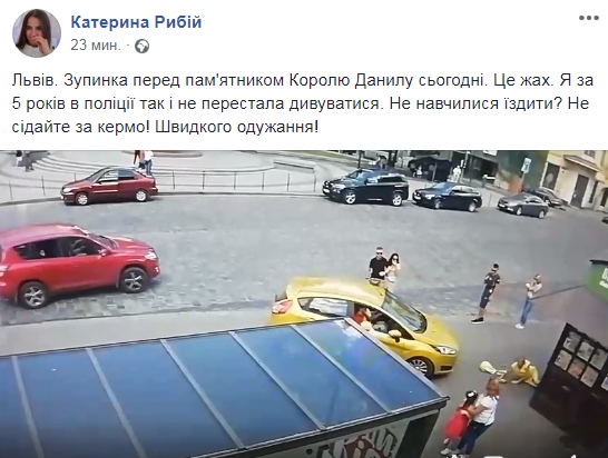 “Львів. Зупинка перед пам’ятником Королю Данилу сьогодні. Це жах. Я за 5 років в поліції так і не перестала дивуватися. Не навчилися їздити? Не сідайте за кермо! Швидкого одужання“, – написала у коментарі до відео з моментом ДТП, речник Патрульної поліції Львівщини Катерина Рибій.