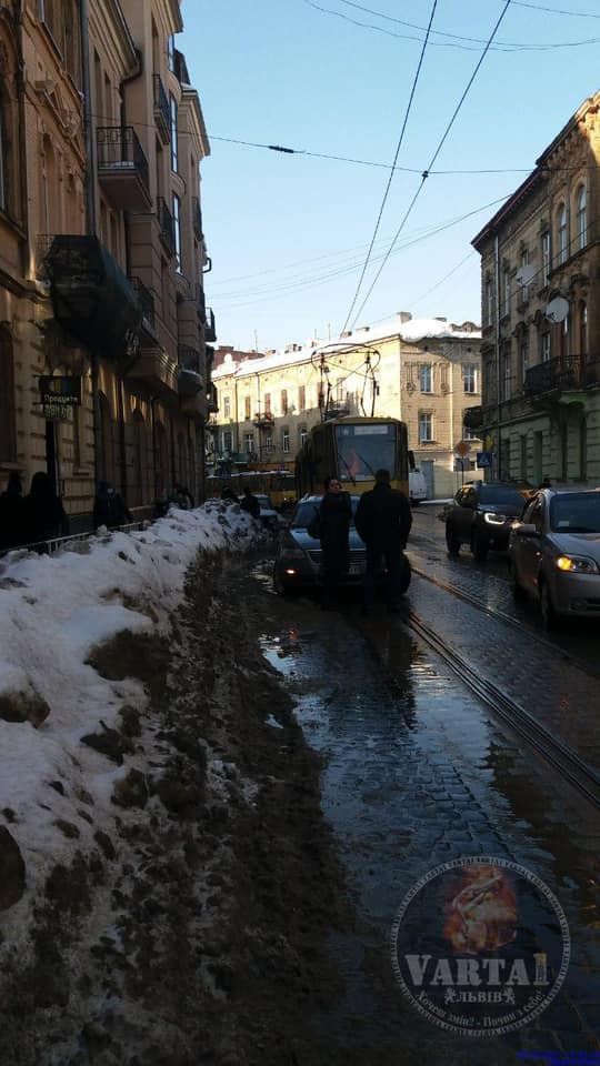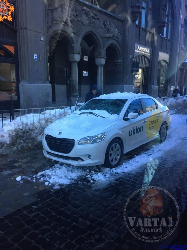 У центрі Львова на автомобіль таксі з даху будинку впала брила снігу.