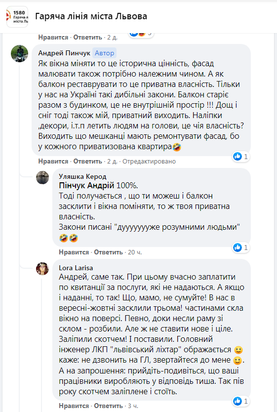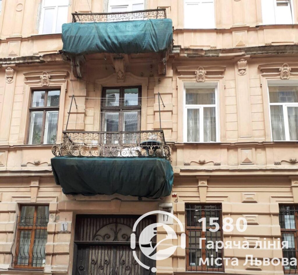 У відповіді на дане звернення адміністратор «Гарячої лінії міста Львова» зазначив: «як повідомили у РА Галицького району, балкон знаходяться у приватній власності власників квартири та повинен ремонтуватись за кошти мешканців. У Галицькій РА зазначили, що ЛКП обтягнуто балкон сіткою. Також у Галицькій РА зазначили, що скеровано лист №162 від 19.04.21 року власнику балкону, щодо відповідальності за належний технічний стан вказаного балкону».