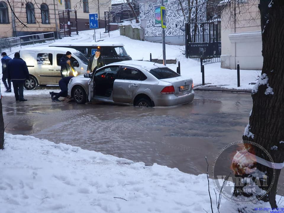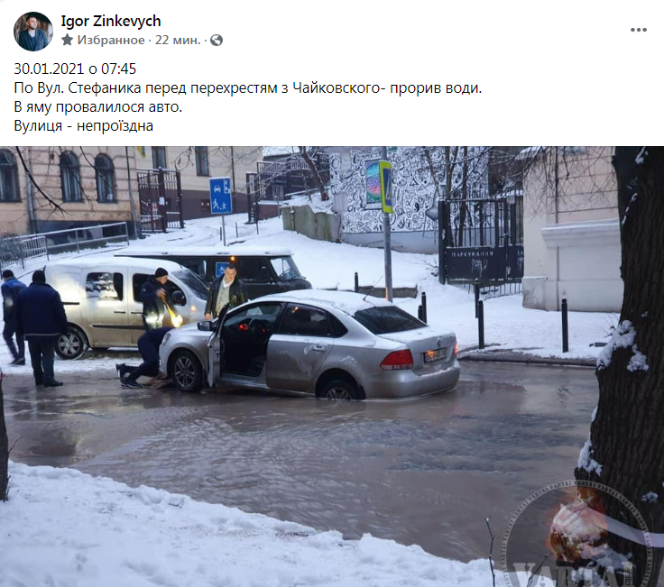 «30 січня о 07:45, по вул. Стефаника, перед перехрестям з Чайковського – прорив води. В яму провалилося авто. Вулиця – непроїзна», – зазначається у коментарі до фото з місця події.
