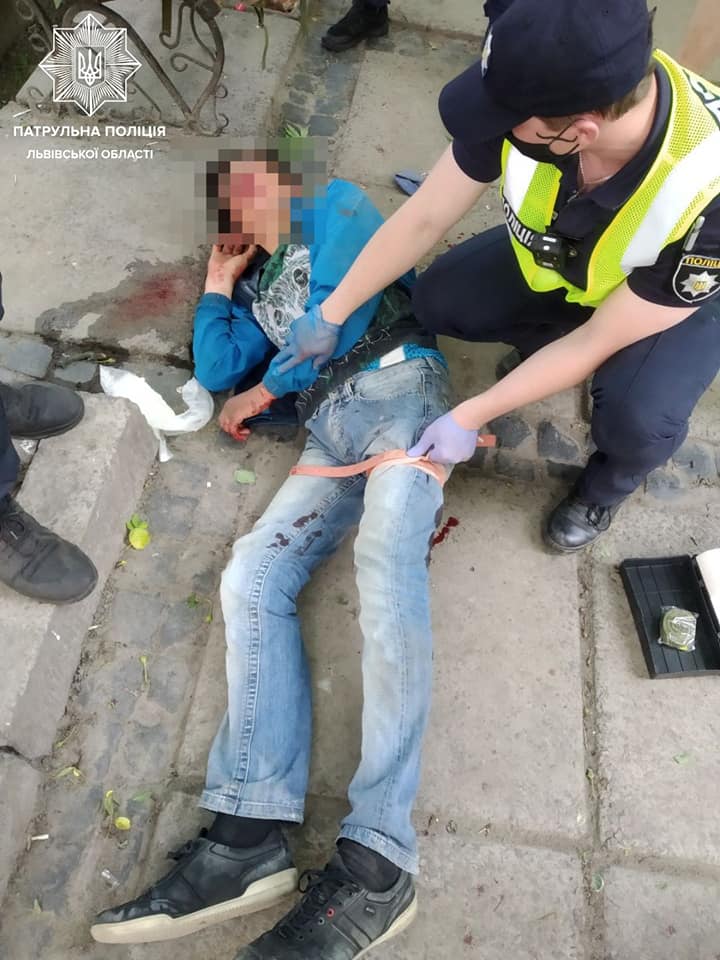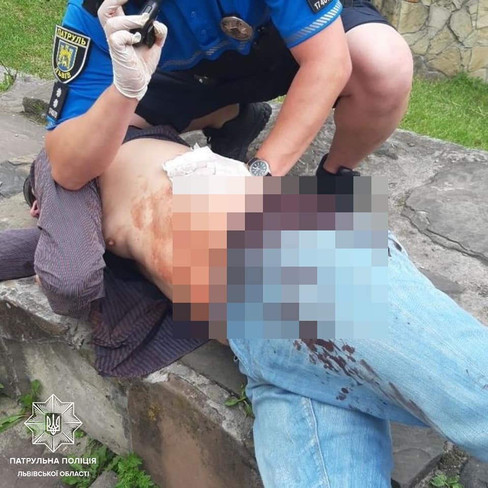 У 47-річного львів’янина, було проникаюче поранення поперека. Він втрачав кров. Велопатрульний Юрій Садига не гаючи часу почав надавати йому допомогу.