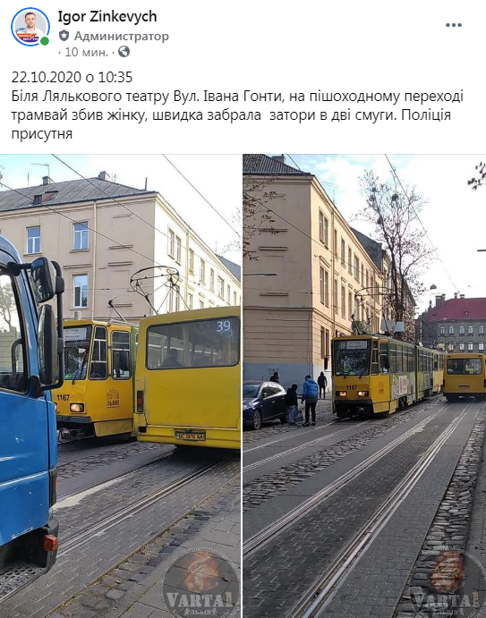 «22.10.2020 о 10:35. Біля Лялькового театру на вул. Івана Гонти, на пішоходному переході трамвай збив жінку, швидка забрала, затори в дві смуги. Поліція присутня», – зазначається у повідомленні на сторінці «Варта 1»,де також оприлюднено світлини з місця події.