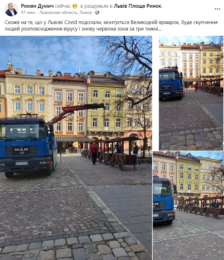 «Схоже на те, що у Львові Covid подолали, монтується Великодній ярмарок, буде скупчення людей розповсюдження вірусу і знову червона зона за три тижні…», – зазначається у дописі.