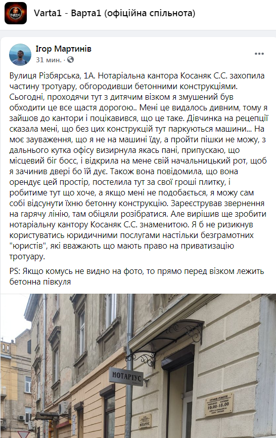 «Вулиця Різбярська, 1А. Нотаріальна кантора Косаняк С.С. захопила частину тротуару, обгородивши бетонними конструкціями. Сьогодні, проходячи тут з дитячим візком я змушений був обходити це все щастя дорогою.. Мені це видалось дивним, тому я зайшов до кантори і поцікавився, що це таке. Дівчинка на рецепції сказала мені, що без цих конструкцій тут паркуються машини… На моє зауваження, що я не на машині їду, а пройти пішки не можу, з дальнього кутка офісу визирнула якась пані, припускаю, що місцевий біг босс, і відкрила на мене свій начальницький рот, щоб я зачинив двері бо їй дує. Також вона повідомила, що вона орендує цей простір, постелила тут за свої гроші плитку, і робитиме тут що хоче, а якщо мені не подобається, я можу сам собі відсунути їхню бетонну конструкцію. Зареєстрував звернення на гарячу лінію, там обіцяли розібратися. Але вирішив ще зробити нотаріальну кантору Косаняк С.С. знаменитою. Я б не ризикнув користуватись юридичними послугами настільки безграмотних “юристів”, які вважають що мають право на приватизацію тротуару», – зазначається у дописі Ігоря Мартиніва у ФБ.