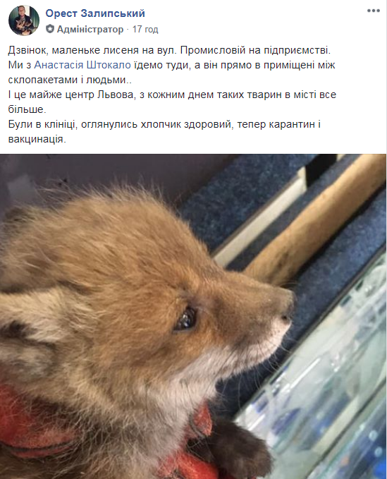 “Маленьке лисеня на вул. Промисловій, на підприємстві. Ми їдемо туди, а він прямо в приміщені між склопакетами і людьми… І це майже центр Львова, з кожним днем таких тварин в місті все більше. Були в клініці, оглянулись хлопчик здоровий, тепер карантин і вакцинація“, – зазначив у дописі до світлини Орест Залипський.