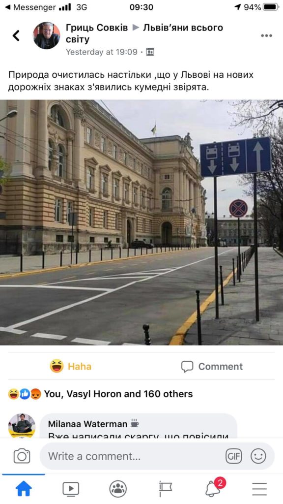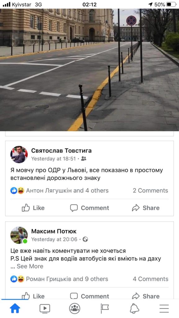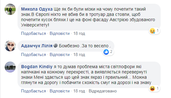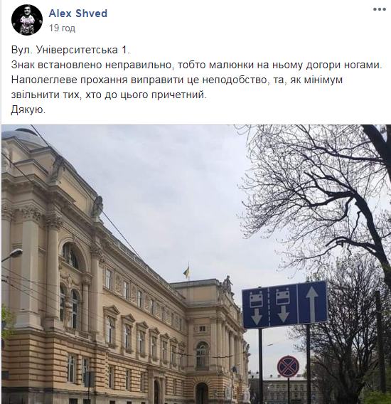 “Вул. Університетська 1. Знак встановлено неправильно, тобто малюнки на ньому догори ногами. Наполегливе прохання виправити це неподобство, та, як мінімум звільнити тих, хто до цього причетний”, – зазначив у зверненні на “Гарячу лінію міста Львова” у ФБ Alex Shved.