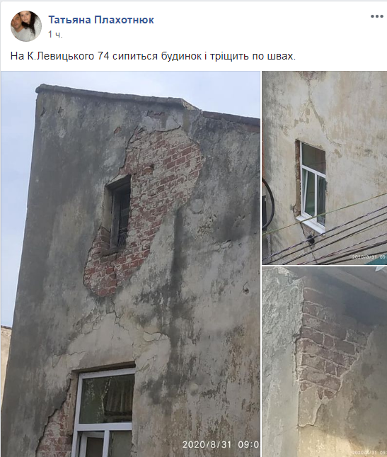 “На вул. К.Левицького, 74 сипиться будинок і тріщить по швах”,- зазначається у зверненні на “Гарячу лінію міста Львова” у ФБ.