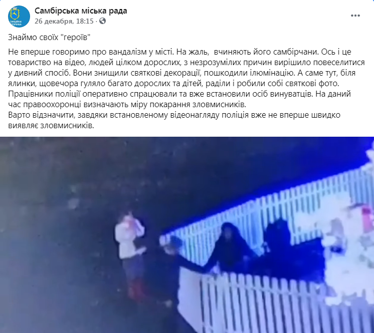 «Знаймо своїх “героїв”. Не вперше говоримо про вандалізм у місті. На жаль, вчиняють його самбірчани. Ось і це товариство на відео, людей цілком дорослих, з незрозумілих причин вирішило повеселитися у дивний спосіб. Вони знищили святкові декорації, пошкодили ілюмінацію. А саме тут, біля ялинки, щовечора гуляло багато дорослих та дітей, раділи і робили собі святкові фото.