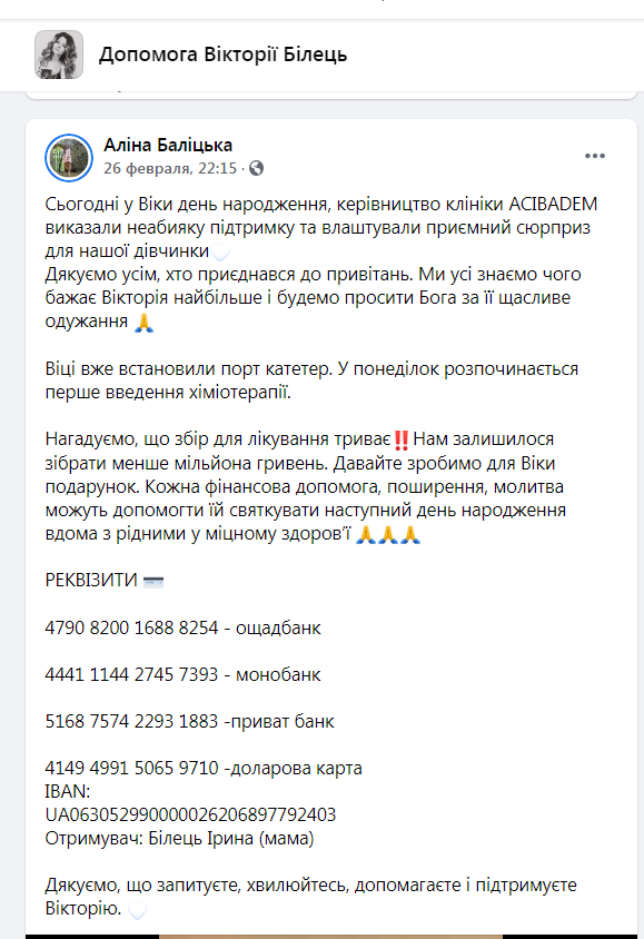 Відомо, що онкологи з Львівщини не змогли надати жінці допомогу, оскільки зауважили, що пухлини неоперабельні і рак уже не вилікувати. Допомогти Вікторії погодилися лікарі з Туреччини.