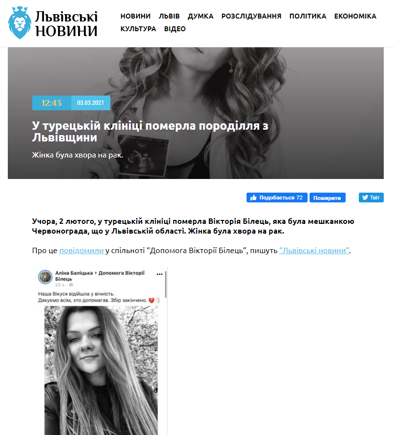 2 березня у турецькій клініці померла Вікторія Білець, яка була мешканкою Червонограда, що у Львівській області. Жінка була хвора на рак.