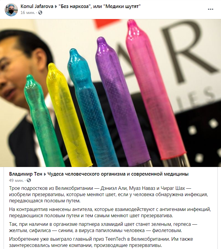 Троє підлітків з Великобританії – Деніел Алі, Муаз Наваз і Чираг Шах – винайшли презервативи, які змінюють колір, якщо у людини виявлено інфекцію, що передається статевим шляхом.