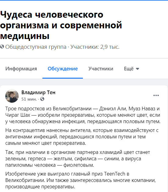 Як зазначає у дописі Володимир Тен, «на контрацептив нанесені антитіла, які взаємодіють з антигенами інфекцій, що передаються статевим шляхом і тим самим змінюють колір презерватива. Так, при наявності в організмі партнера хламідій колір стане зеленим, герпесу – жовтим, сифілісу – синім, а вірусу папіломи людини – фіолетовим. Винахід вже виграло головний приз TeenTech в Великобританії. Ними також зацікавилися багато компаній, що виробляють презервативи».