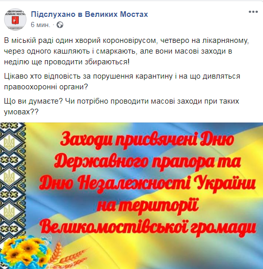 “В міській раді один хворий коронавірусом, четверо на лікарняному, через одного кашляють і смаркають, але вони масові заходи в неділю ще проводити збираються! Цікаво хто відповість за порушення карантину і на що дивляться правоохоронні органи? Чи потрібно проводити масові заходи при таких умовах?“, – зазначається у дописі.