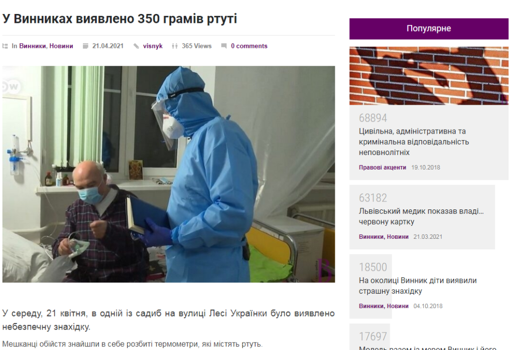 Як зазначається, “у Винниках виявлено 350 грамів ртуті. 21 квітня, в одній із садиб на вулиці Лесі Українки було виявлено небезпечну знахідку. Мешканці обійстя знайшли в себе розбиті термометри, які містять ртуть. На місце надзвичайної події негайно викликали рятувальників і правоохоронців. Зі слів очевидців події, небезпечну знахідку вилучено”.
