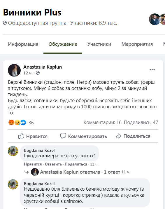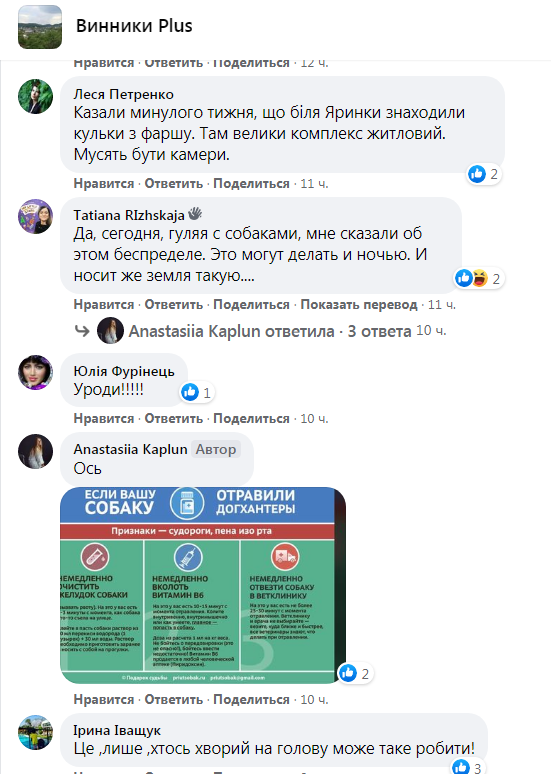 «Верхні Винники (стадіон, поле, Негри) масово труять собак (фарш з труткою). Мінус 6 собак за останню добу, мінус 2 за минулий тиждень. Будь ласка, cобачники, будьте обережні. Бережіть себе і менших друзів. Готові дати винагороду в 1000 гривень, якщо хтось знає хто то»,- написала Anastasiia Kaplun.